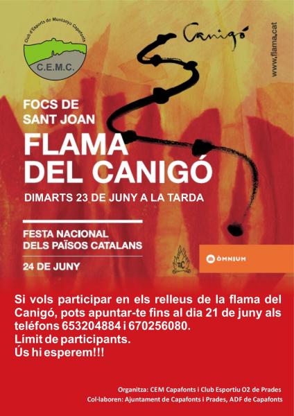 Un any més, portarem la Flama del Canigó corrent per relleus, organitzats pel CLub d'ESports de Muntnaya de Capafonts i Prades, des d'Alcover fins a Capafonts ( 22 km.), on encendrem la foguera de Sant Joani es llegira el manifest.