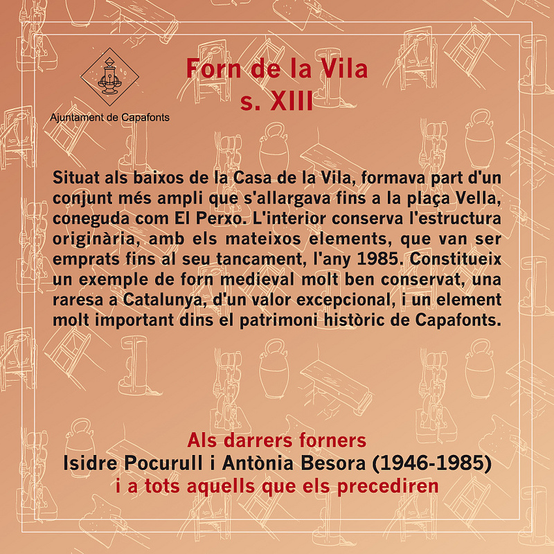 Situat al semi-subterrani de l'ajuntament, el forna de pa de Capafonts data del del segle XIII i és una de les construccions més importants del poble. El seu estat de conservació és excepcional i actualment està en procés d'habilitació per poder rebre visites.