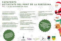 Amb l’arribada del Pont de la Puríssima, Capafonts enceta un programa d’activitats nadalenques adreçat a tots els veïns i visitants. Les propostes, organitzades amb la col·laboració de diverses entitats del municipi, ompliran els dies 6, 7 i 8 de desembre d’activitats culturals, lúdiques i tradicionals.